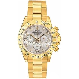 18kt yellow gold case and bracelet. White mother-of-pearl dial with 10 diamonds. Chronograph. Tachymeter. Synthetic sapphire crystal. Case diameter 40mm. 44 jewel chronometer automatic movement. Water resistant at 30 meters (100 feet).