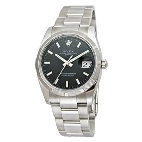 Rolex Oyster Perpetual Date Watches (updated design - launched May 2007). 34mm polished stainless steel case, engine turned bezel, black dial, index hour markers, and Oyster bracelet with brushed outer links and polished center links.