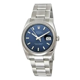 Stainless steel case and bracelet watches. Blue dial. Date displays at 3 o'clock position. Scratch resistant sapphire crystal. Deployment clasp. Case diameter 34mm. Automatic movement. Water resistant.