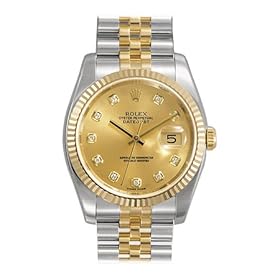 Mens watch 18kt yellow gold and stainless steel case and bracelet. Champagne dial with 10 diamond hour markers. Date displays at 3 o'clock position. Synthetic sapphire. Hidden deployment clasp. Case diameter 36mm. 31 jewel chronometer automatic movement. Water resistant at 30 meters (100 feet).