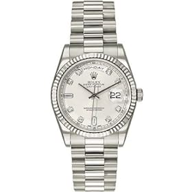 Mens watches with 18kt white gold case and bracelet. Silver dial with 10 diamond hour markers. Date displays at 3 o'clock position. Day displays at 12 o'clock position. Synthetic sapphire crystal. Case diameter 36mm. 31 jewel chronometer automatic movement. Water resistant at 30 meters (100 feet)