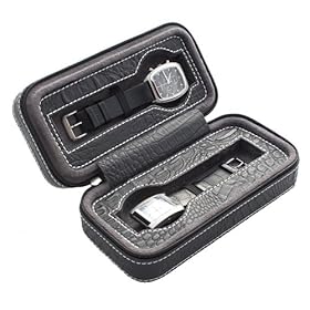 Black Soft Touch High Quality Crocodile Leatherette Compact Travel Watch Case With Suede Interior Holds 2 Watches.
