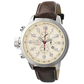 Mens watch Invicta's Force Collection Lefty chronograph watch for men is a classically styled timepiece that features a round, 59-millimeter stainless-steel case, a smooth brown leather band and a beige dial showcasing Arabic hourly indices, a tachymeter function around the perimeter, three sub-dials for tracking hours, minutes and seconds, and a date function at the four o'clock. This casually elegant timepiece is water resistant to 330 feet, giving you the performance you need when it counts.