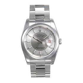 Mens watch Stainless steel case and bracelet. Silver and grey dial. Date displays at 3 o'clock position. Synthetic sapphire crystal. Deployment clasp. Case diameter 36mm. 31 jewel chronometer automatic movement. Water resistant at 30 meters (100 feet).