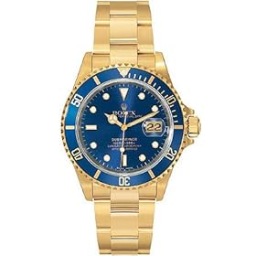 Mens watch 18kt yellow gold case and oyster bracelet. Blue dial and blue bezel. Special time-lapse bezel. Pressure proof to 1000 feet. 31 jewel chronograph movement. Synthetic sapphire crystal. Double Locking Deployment clasp and extension link. Date displays at 3 o'clock position. Case diameter 40mm. Rolex Model Number 16618.
